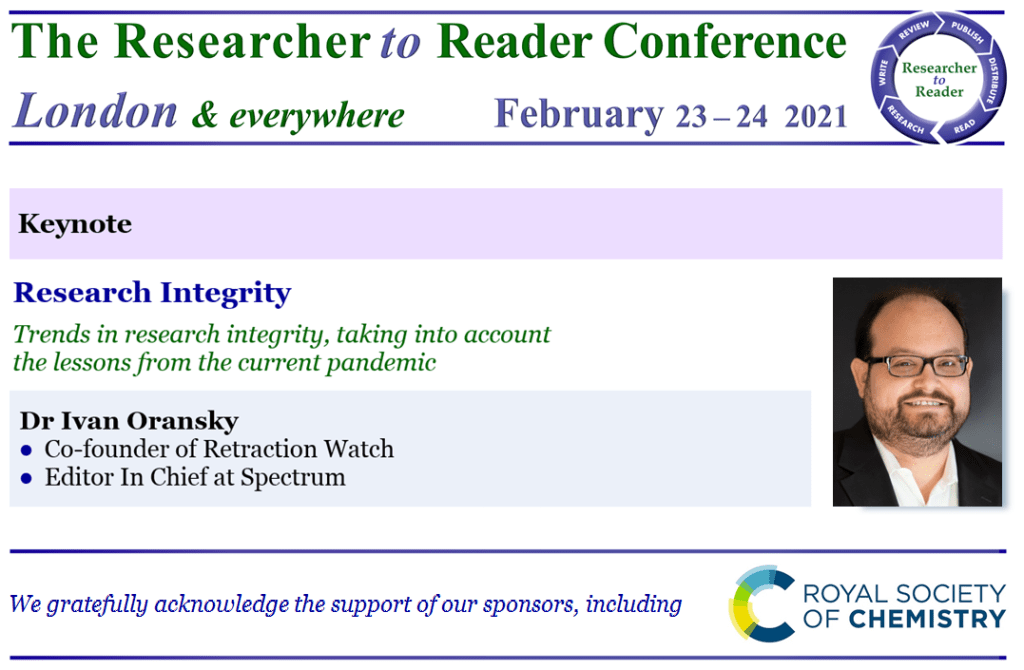 We have an outstanding line-up at the hybrid, fully-interactive Researcher to Reader Conference on 23-24 February 2021, including Dr Ivan Oransky, one of the founders of Retraction Watch.