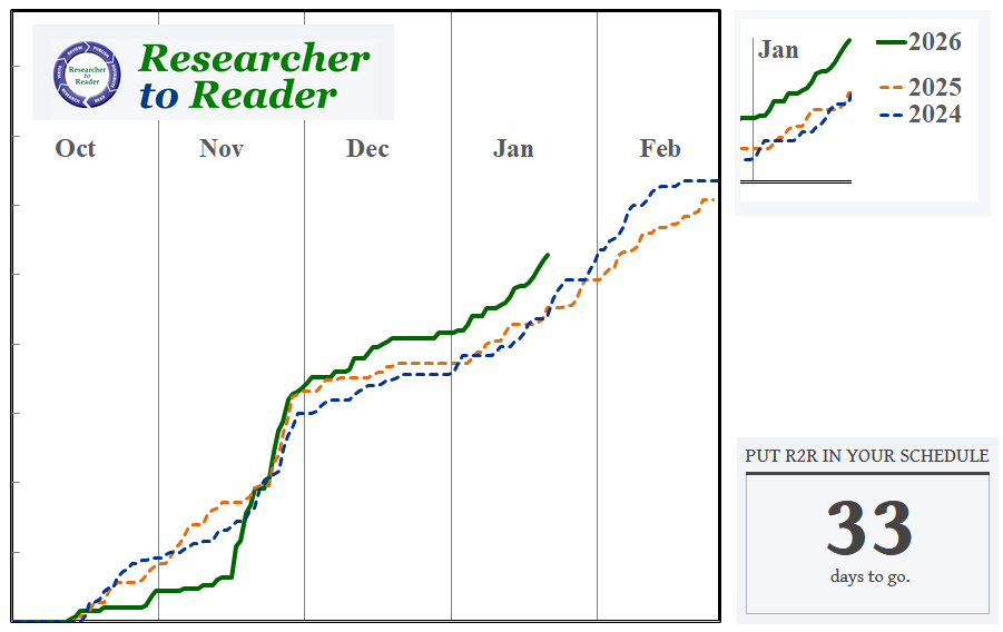 Registered participant numbers for the Researcher to Reader Conference are encouragingly high; about 15% above the registration levels at this time in 2025 or 2024, with about one month to go before the meeting.